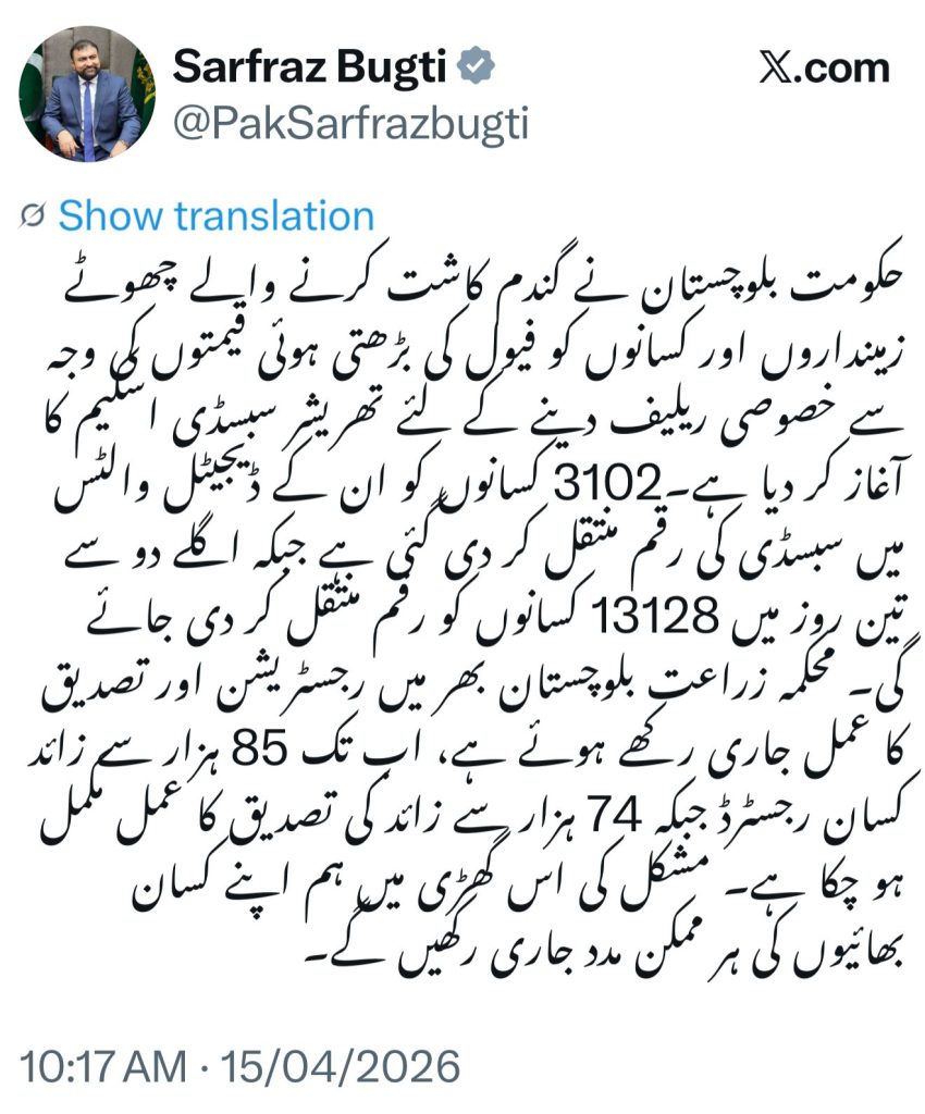 آئندہ 2 سے 3 روز میں مزید 13128 کاشتکاروں کو ادائیگیاں کی جائیں گی، وزیر اعلیٰ بلوچستان میر سرفراز بگٹی